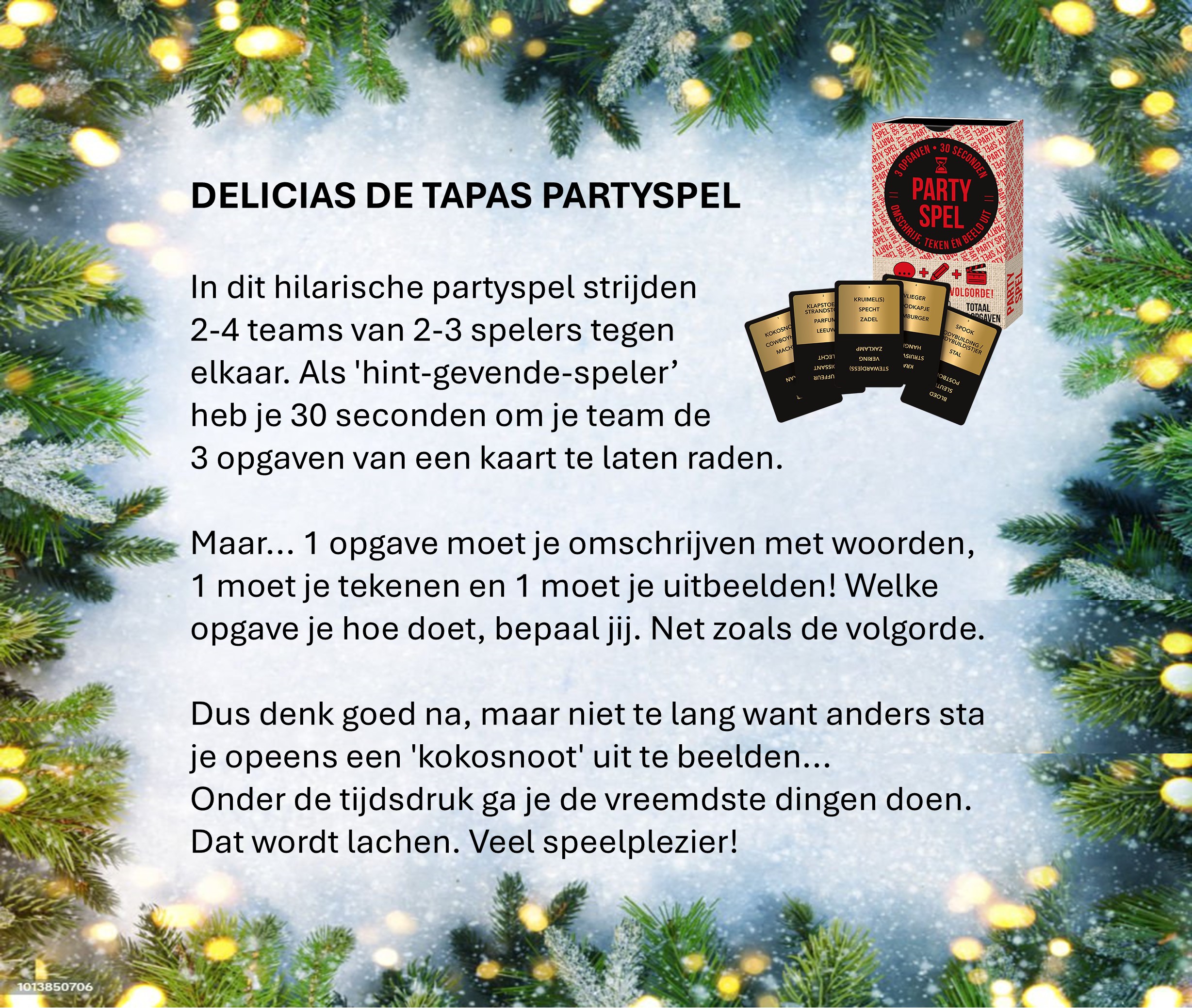 Genieten in grootse stijl! Dit uitgebreide tapas kerstpakket bevat alles voor een complete borrelavond: van hartige hapjes en smaakvolle dips tot bijzondere drankjes en een luxe tapasplank met schaaltjes. Perfect om samen te delen tijdens de feestdagen.